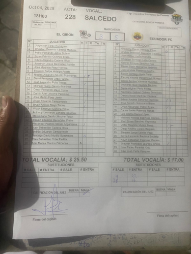 | EL GIRÓN | 2 : 0 | Pacífico |